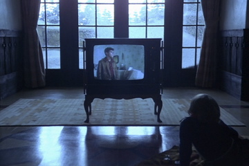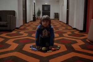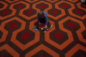 Enquanto Danny brinca sozinho, uma bola de tênis aparece, e o padrão das listras do carpete se altera, sugerindo uma manipulação espacial.