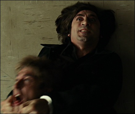 “Quando ele se levantou da cadeira puxou as chaves que estavam presas ao cinto e abriu a gaveta da escrivaninha para pegar as chaves da cela. Estava ligeiramente curvado quando Chigurh se agachou e passou rapidamente as mãos algemadas por baixo dele até a parte de trás dos joelhos. No mesmo movimento sentou-se e rolou para a frente e passou a corrente por baixo dos pés e então se pôs de pé no mesmo instante e sem esforço algum.”
