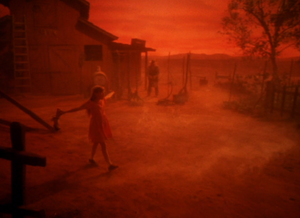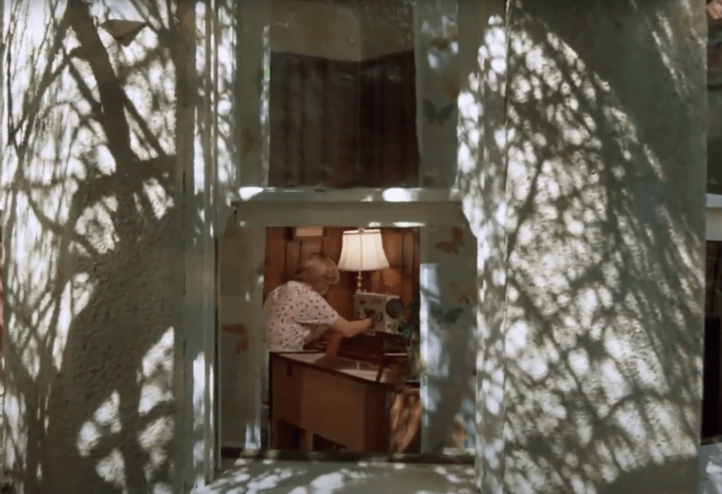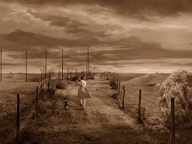 A cena de abertura, imediatamente após os créditos iniciais, faz uma clara homenagem a “O Mágico de Oz” (1939). Essa sequência inicial é estilizada como um prólogo em um set de estúdio saturado de vermelho Technicolor, apresentado no formato 1.37:1 (padrão dos filmes antigos até os anos 1950). Vemos Alice, uma criança em uma fazenda que remete ao Kansas de Dorothy.