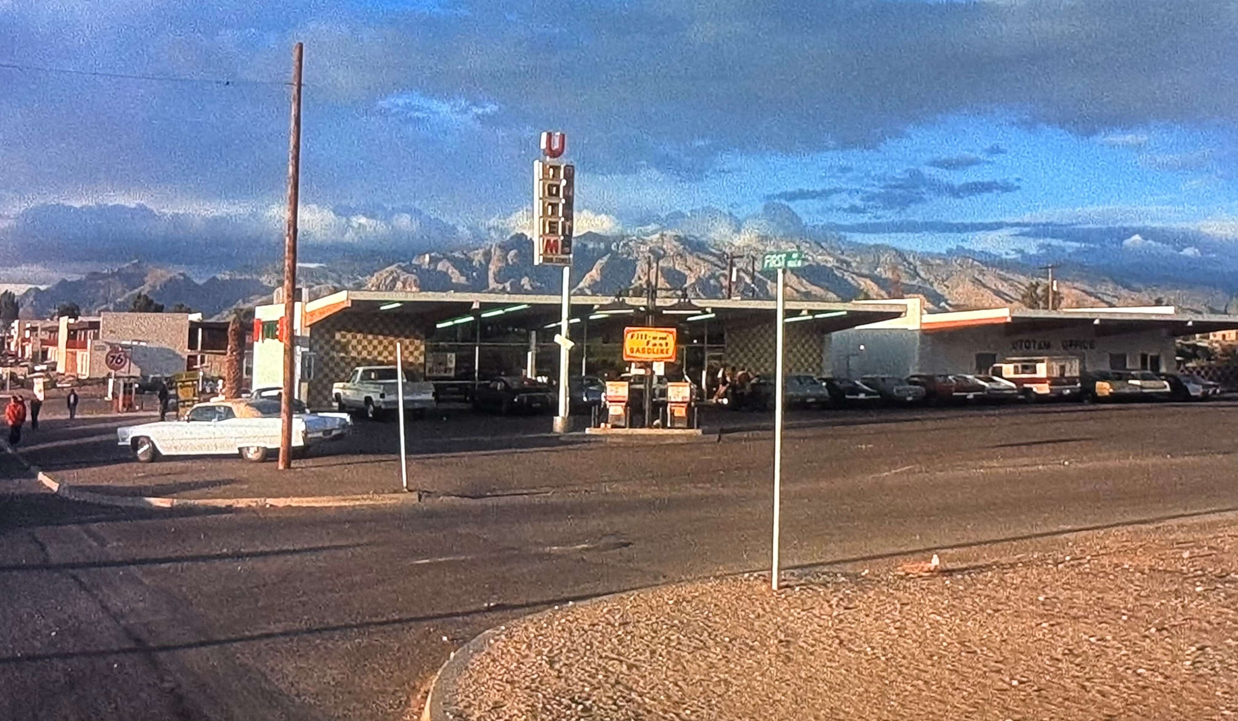 lembra a fotografia de Shore, “Center Street Gas Station, Kanab, Utah” (9 de agosto de 1973) – que apresenta um posto de gasolina similar em um ambiente desértico com montanhas distantes, veículos da época e uma atmosfera de tranquilidade estática, ecoando a transição visual do filme do prólogo fantástico para a realidade crua do deserto americano.