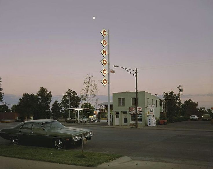 A imagem inicial em Socorro, Novo México, com sua composição ampla de uma estação de gasolina U-Totem, carros vintage estacionados, montanhas ao fundo e um céu nublado sobre uma paisagem árida e cotidiana, evoca o estilo fotográfico de Stephen Shore, especialmente suas obras da série “Uncommon Places” dos anos 1970. Shore é conhecido por fotografar cenas banais da América vernacular – postos de gasolina, motéis, ruas desertas e paisagens suburbanas do Sudoeste dos EUA – com cores vivas, enquadramentos frontais e uma sensação de isolamento e mundanidade. Perceba como esta cena: