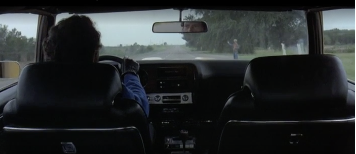 Considere o Motorista e o Mecânico, esses arquétipos da era “flower power”: com seus cabelos desgrenhados e olhares distantes, eles encarnam a estética da rebeldia, ziguezagueando pela paisagem do sudoeste norte-americano em um Chevy 1955 modificado. A suposta liberdade irrestrita — essa errância sem amarras — expõe um falso individualismo. Sem metas além da próxima corrida, sem apostas que que coloquem em risco a própria existência, eles se tornam invólucros, lataria, meros ocupantes de um veículo que os define mais do que qualquer desejo interior. Tanto que o interior do veículo se torna parte integrante da paisagem em widescreen, como vemos nesta cena: