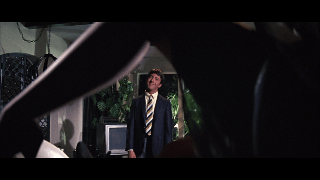 No quarto, ela tenta seduzi-lo, e então o marido chega. Benjamin desce as escadas assustado, e encontramos a sala sob a perspectiva de outra iluminação, com mais sombras. Temos, cinematograficamente, o surgimento de um segredo, e configuração da Sra Robinson como alguém que se tornou, a partir daquele momento, assustadora.