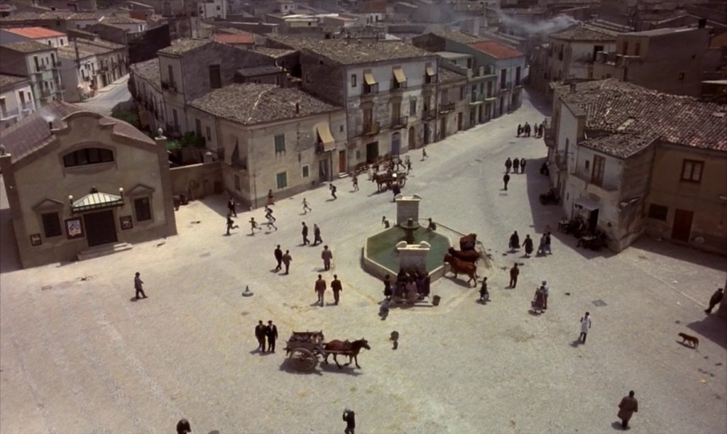 Cenários simbólicos são usados para refletir conflitos psicológicos e morais, e o Cinema Paradiso, com sua arquitetura rústica e cadeiras desgastadas, serve como microcosmo da comunidade de Giancaldo. Cenas como a projeção de filmes na praça pública ou o incêndio que destrói o cinema original dramatizam a transição de uma era de conexão para uma de fragmentação. A cenografia da vila, com ruas estreitas e praças vibrantes, contrasta com os ambientes impessoais de Roma, intensificando a nostalgia. A reconstrução moderna do Cinema Paradiso é a confirmação da irrecuperabilidade do passado: aquilo que se perdeu não será resgatado, nem substituído.